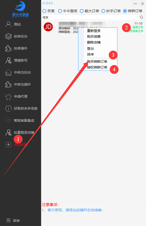2.注册登录后,左下角+号添加店铺,可添加多店铺(即“店群管理”),右击可以选择续费、登录等,点击【拍单后台】跳转网页版下单界面。可以选择购买相应服务,右击购买、授权。